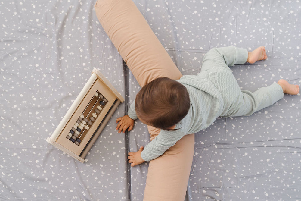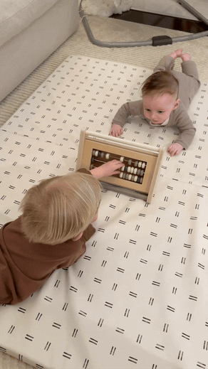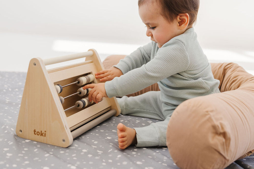 I love the addition of the wooden abacus on the back. It transitions the toy from a visual tool to a fine-motor activity as the baby grows.
