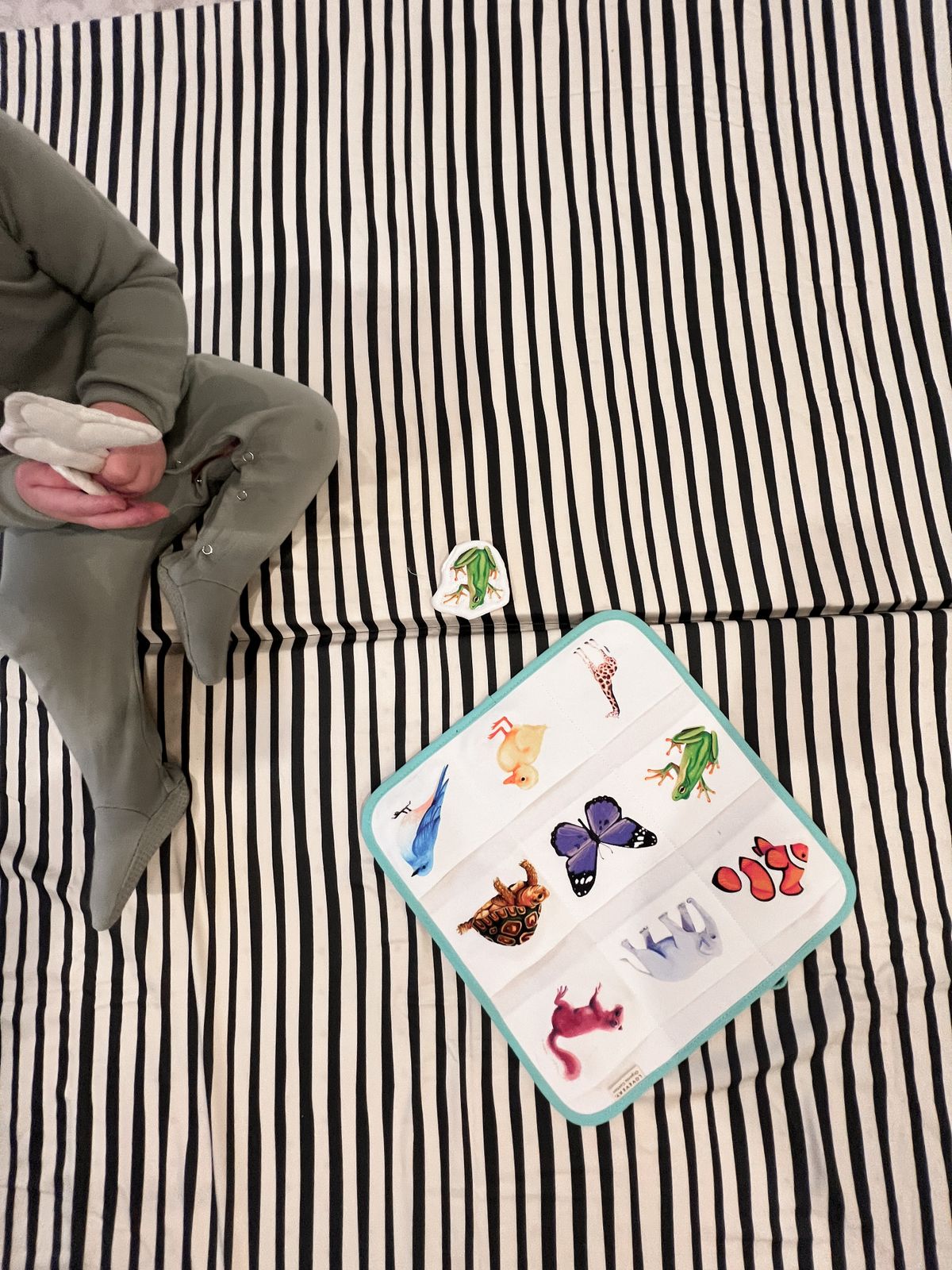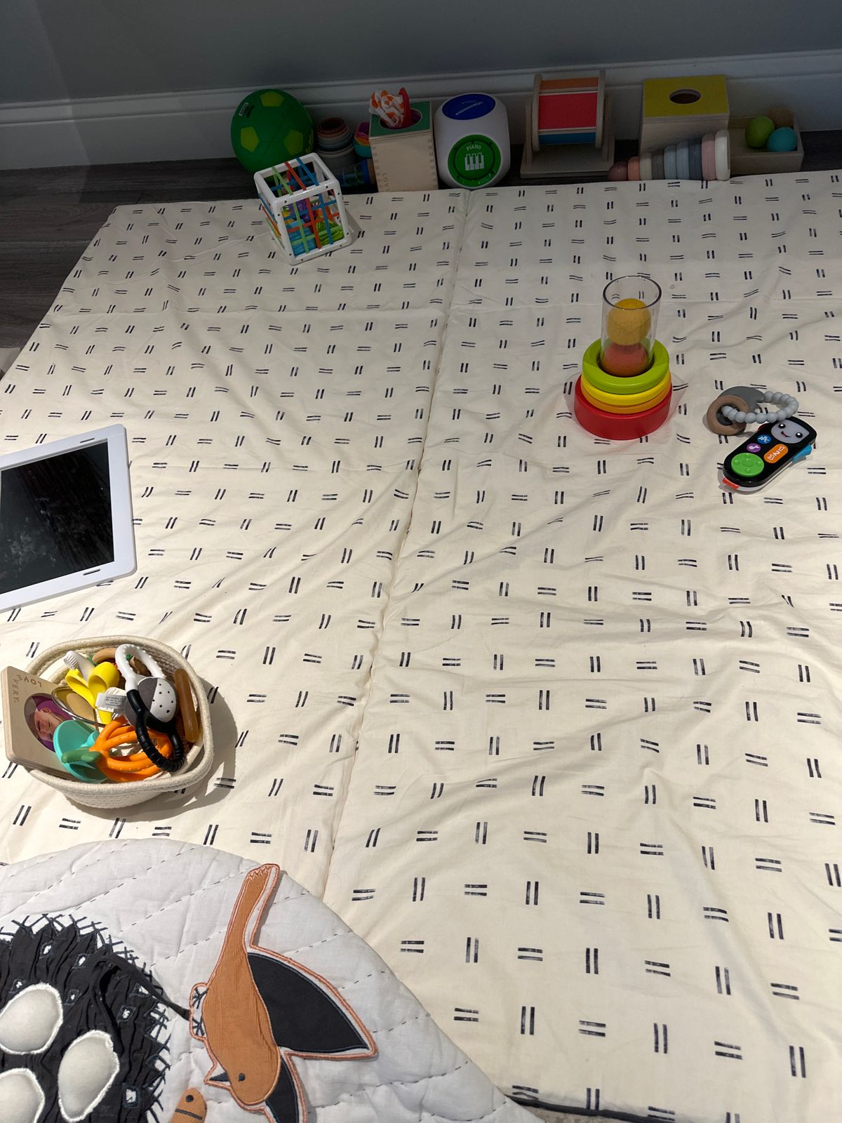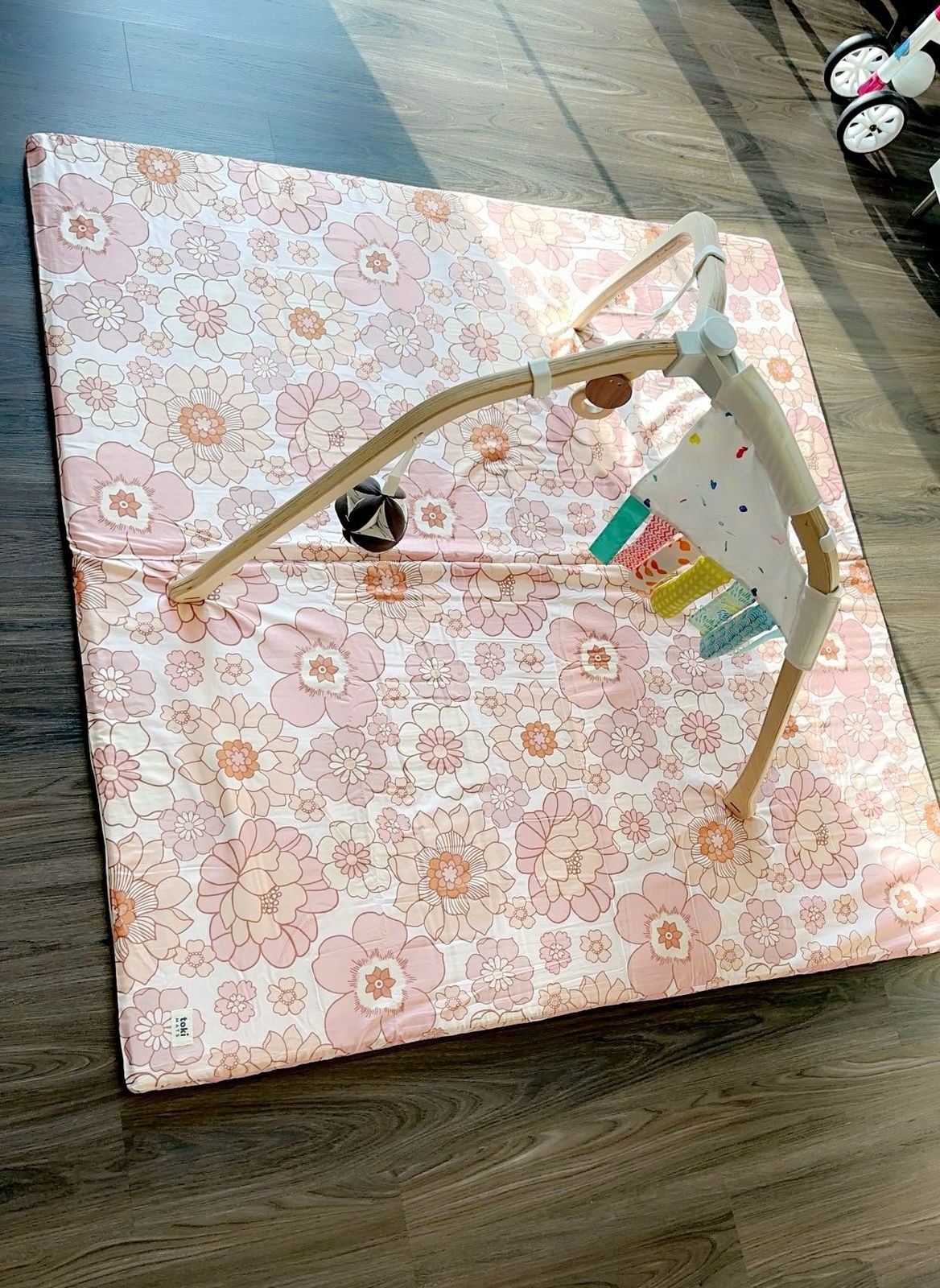 I’m in LOVE with the mat thickness and consistency, the cover is super cute, we love laying on it, and I love that the materials are nontoxic. Wish #1: please make a bigger size! My 7 mo old is super active, and it would be great to have a bigger size to span the room (maybe 8x10 😍); Wish #2: the mat itself is actually in 2 pieces, and there is a gap between the pieces that leaves a space (albeit small) of uncushioned space. Our little one somehow already found the gap with his noggin! I will say that the gap between the pieces shrinks when you wash the cover, so about 5 inches has shrunk to about 3 inches of unprotected space. Regardless, still a wonderful mat