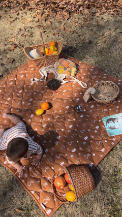 Ready for every family adventure, this roll-up picnic blanket features organic quilted cotton and a water repellent coating for comfort and convenience.